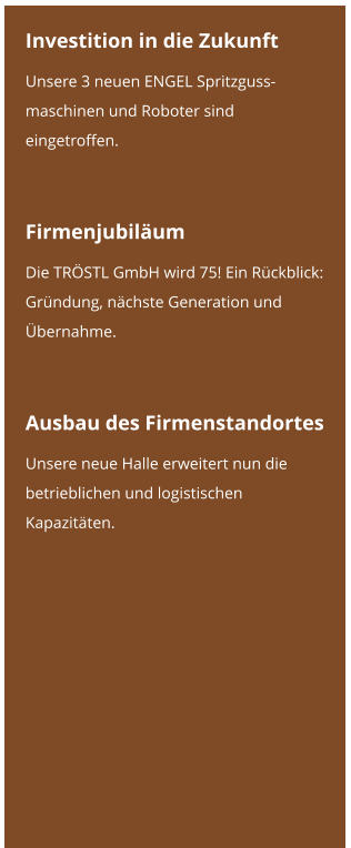 Geplant, gefertigt und produziert wird ausschließlich am Firmenstandort in Berndorf. Damit sichert die TRÖSTL GmbH heimische Arbeitsplätze und regionale Wertschöpfung.Seit 1997 ist die TRÖSTL GmbH nach ISO 9001 zertifiziert.